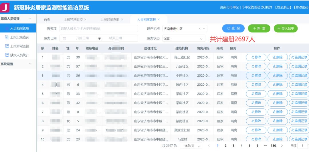 2月14日,京柏医疗联合农工党济南国际医学科学中心向济南市市中区防疫指挥部捐赠自主研发的“新冠肺炎居家隔离健康管理追访系统”,以便市中区防疫指挥部更好地利用互联网,提高疫情防控效率,保障全区人民身体健康。该系统由魏家庄街道办作为上线试点区域,开展使用顺利,现已上线济南市市中区正式使用,截至目前,系统共管理隔离人群2697人。
