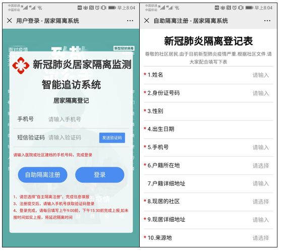 隔离人员可以通过手机登记测量的体温、不适症状等信息,每日对自己的身体健康状况进行及时上报,上报的健康信息通过“新冠肺炎疫情居家监控系统”可自动汇总、统计。卫生管理人员可远程获取所管辖区域居民的健康信息,并对数据进行持续追踪、快速调用。