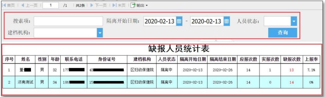卫生管理人员可以在系统PC端搜索隔离人员,查询隔离人员上报的体温、血氧数据,也可以通过搜索列表选择隔离人员,修改监测记录。对监控异常和缺报等情况,系统会自主生成监测异常统计表和缺报人员统计表进行上报。