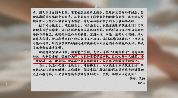 对她而言,“预防远重于治疗”。这份清醒的认知,让她与由三甲医院和互联网医院多学科专家构成的“立体守护团队”紧密相连,开启了一段跨越地域,从院内产检延伸到居家健康管理的科学孕育旅程。在宝宝即将诞生之际,吴女士怀着深深的感激,写下了两封情真意切的感谢信。她的故事,不仅是对天使医生服务的认可,更是一位母亲用亲身经历,诠释何为“有备而来的爱”。