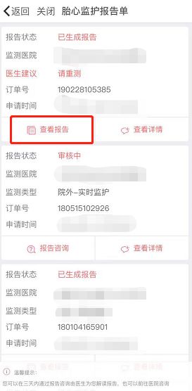 5. 在【医院】栏点击【胎心报告】,点击【查看报告】可以查看监护中心审核后的胎心监护报告单。
