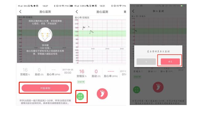 4.按手机提示找到胎心,点击【开始录制】进行胎心音录制;点击中央【小脚丫图标】数胎动;测量满40分钟后即点击【结束监护】按钮,结束当前监护。